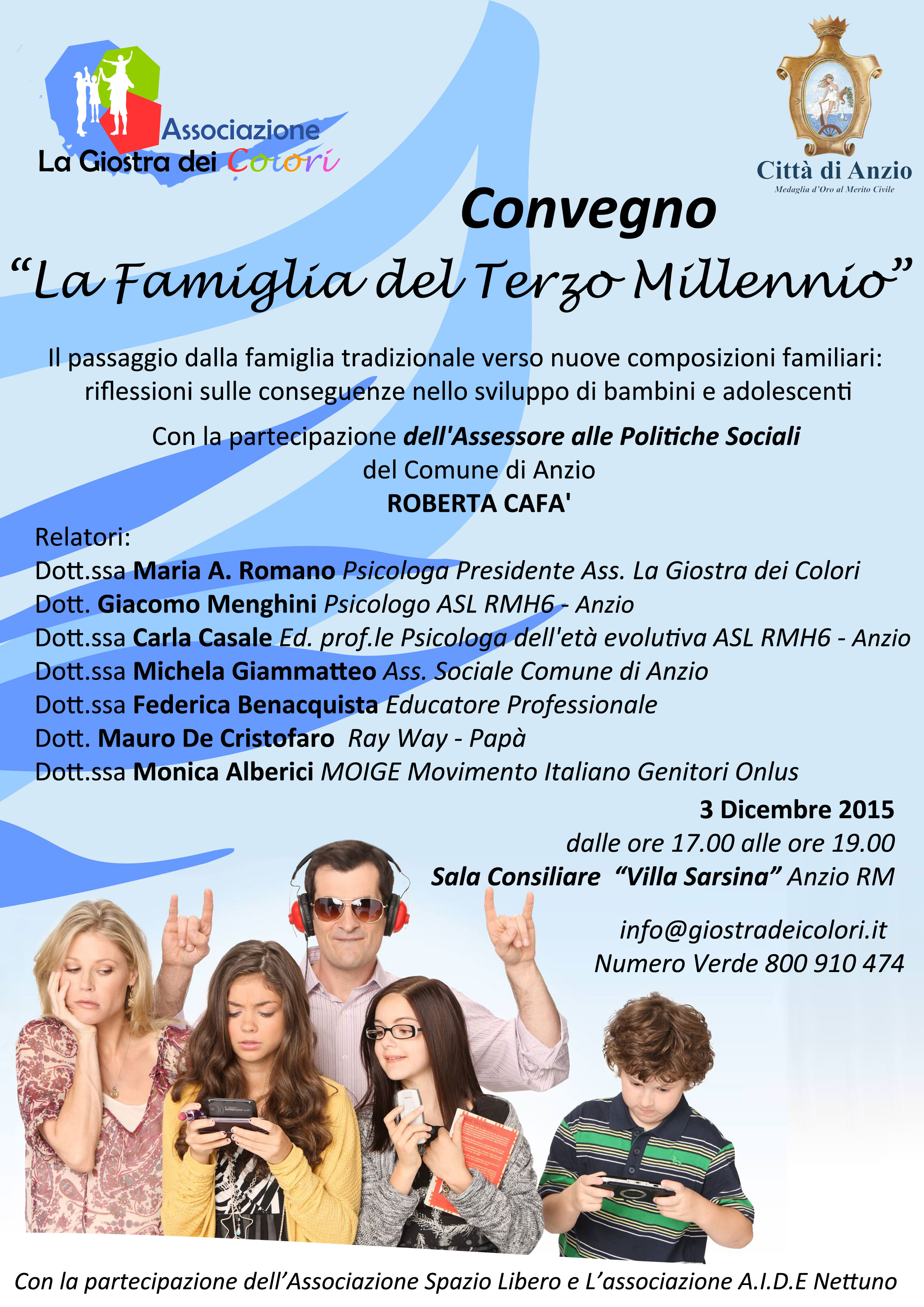 Convegno “La Famiglia del Terzo Millennio” organizzato dall’associazione la Giostra dei Colori si tirrà il 3 Dicembre 2015 dalle 17 alle 19 nella Sala Consiliare “Villa Sarsina” Anzio RM.